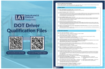 IAT Insurance Group has DQ file folders available to our insureds. The front cover provides a QR code to our Loss Control website and a direct link to DOT regulations guidance. Additionally, the inside cover provides a DQ checklist to help maintain your driver files in compliance with DOT regulations.